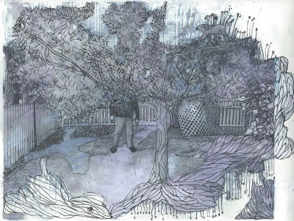 The technical choices I’ve made are significant—the gel medium transfers create that crucial layer of removal from reality that mirrors how memory itself becomes increasingly distant and fragile. The deliberate degradation of images becomes a visual metaphor for the disease’s progression. At the same time, my ink additions serve as a bridge between what was lost and what remains, between documented reality and the interior landscape of illness.